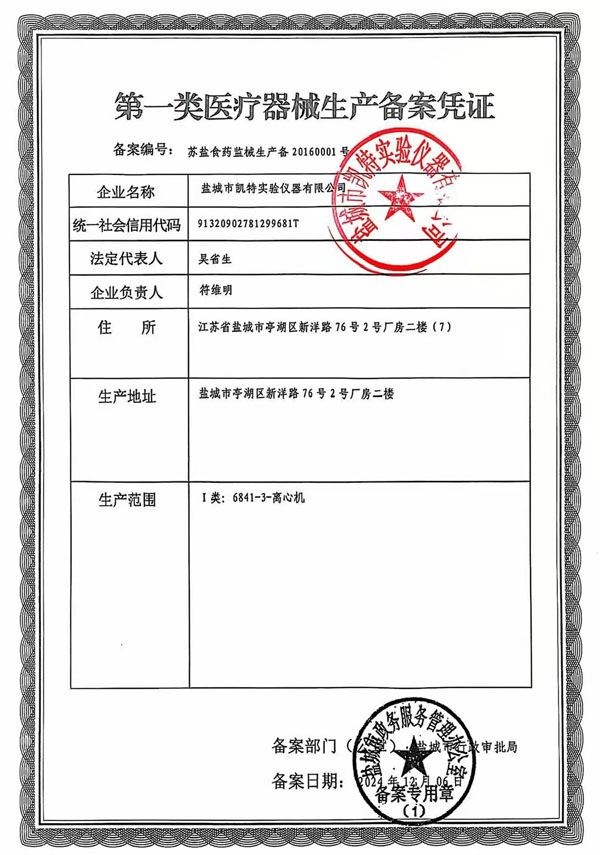 第一類醫療器械生產備案憑證